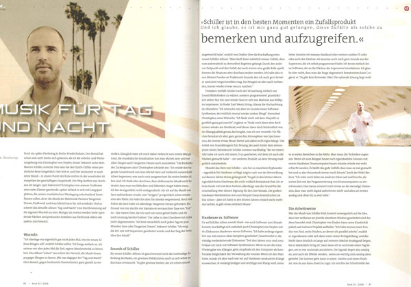 Beat, das Magazin für Musikproduktion, Ausgabe 02 / 2006 In dem vierseitigen Bericht gibt Schiller Auskunft über seine Arbeitsweise im Tonstudio, die Entstehung seines aktuellen Albums "Tag und Nacht", die Live-Tour 2006 und seine Zielsetzungen.
