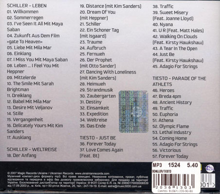 Veröffentlichungsland: Ukraine Beschreibung: Auf der CD befinden sich die unten angegebenen Alben im mp3 Format. Das Label "Magic Records Ukraine" gibt es wirklich. Mit Barcode und Hologramm auf dem Backcover. Maschinell gedruckte Cover. Trotzdem kein offizieller Release sondern ein Fake. Fazit: CDmp3 Album in hochwertiger Aufmachung! Nicht leicht als Fälschung zu erkennen, aber es gibt keine offizielle Schiller mp3-CD!