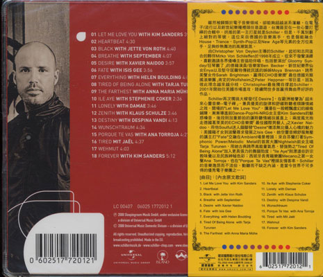 Veröffentlichungsland: Taiwan Asien Edition des Albums Sehnsucht im Super Jewel Case mit Obi Strip Neu zusammengestellte Trackliste aus beiden CDs der deutschen Sehnsucht Super Deluxe Edition, sowie dem schon auf dem Album "Tag und Nacht" veröffentlichten Song mit Tarja Turunen "Tired Of Being Alone" (Track 8)