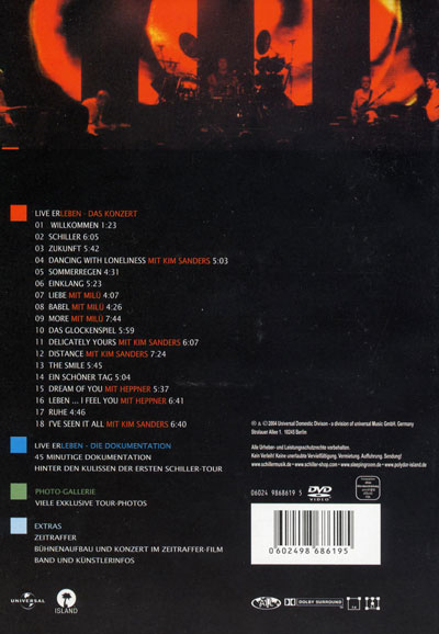 Live DVD von der Frühjahr Tour 2004. Aufgenommen in der Philipshalle Düsseldorf am 22.04.2004 Ein vollständiges Schiller-Konzert auf DVD. In Dolby Surround Neue Auflage (?) im normalen DVD Case. Zudem fehlt der "Sleepingroom" Label Aufdruck unten auf dem Backcover im Gegensatz zur "Super Jewel Case" Edition. Die Trackliste der DVD ist identisch.
