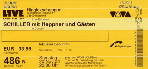 Eintrittskarte zum zweiten Teil der Schiller-Live-Erleben-Tour. Ringlokschuppen Bielefeld, 20.11.2004