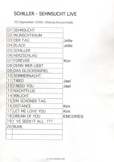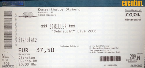Eintrittskarte für die Schiller "Sehnsucht" Tour 2008 in der Konzerthalle Olsberg am 02. September 2008