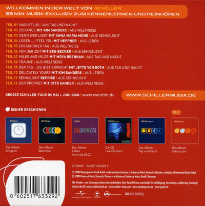 Auf dieser "Schiller zum Kennenlernen CD" befindet sich ein 23miütiger Track, bei dem 12 Schiller Songs aus fast allen bisherigen Alben angespielt werden. Exklusiv bei Amazon.de zu bekommen. Werbe-CD im Pappcover