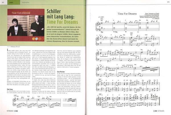 Keyboards, das Magazin für Tasteninstrumente, Ausgabe Mai 2008 Bericht zur Single und ZDF Olympia-Hymne "Schiller mit Lang Lang - Time For Dreams" mit Noten zum Nachspielen