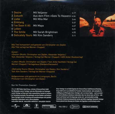 Promo CD von Schillers drittem Album "Leben" In Dolby Sourround Da die Lieder ineinander übergehen und eine andere Reihenfolge haben, wie auf dem entgültigen Album, hat diese CD einen ganz eigenen Charakter.