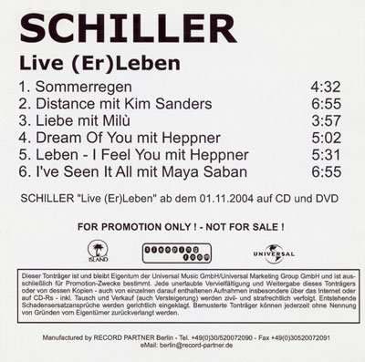 Schiller's erste Live-CD mit den Highlights der Früjahr-Tournee 2004 als Promo Album Mit einem Druckfehler auf dem Cover: Track 6 wurde auf der Schiller Tour (und damit auch auf der Live CD) von Kim Sanders gesungen und nicht wie hier angegeben von Maya Saban. Sie hat das Lied zwar im Original (Studio Album "Leben") gesungen, auf der Tournee war Maya aber nicht dabei!
