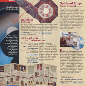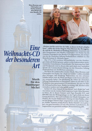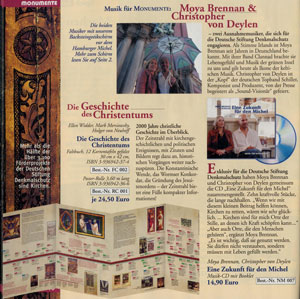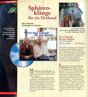Monumente, das Magazin für Denkmalkultur in Deutschland, Nr. 11/12, Ausgabe Dezember 2005 In dem einseitigen Bericht werden Moya Brennan und Schiller vorgestellt, sowie die Beweggründe für die Benefiz CD "Eine Zukunft für den Michel" erläutert Auch in den folgenden DIN A5 "Monumente" Heften (Beilagen der Promotion Post) wird mit dem Artikel für die CD "Eine Zukunft für den Michel" geworben.