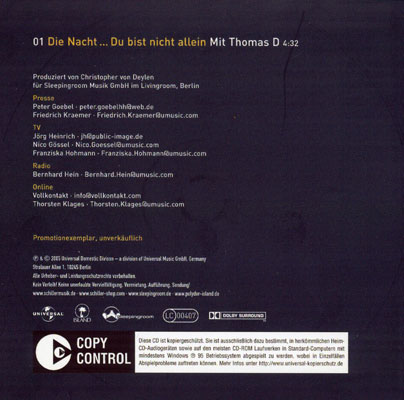 Schiller's erste Auskopplung aus dem Album "Tag und Nacht". Hier die Promo CD. Gastsänger ist Thomas D. von den Fantastischen Vier.