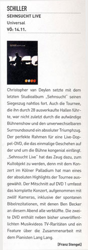 Piranha, das kostenlose Magazin in Zusammenarbeit mit dem Elektrofachmarkt Saturn. Ausgabe November 2008 Kurzer Artikel zur DVD "Sehnsucht Live"