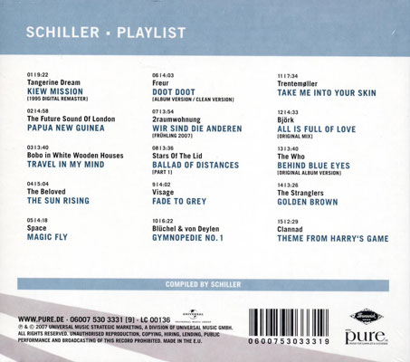 Schiller präsentiert seine ganz persönlichen Musikhighlights. Auf der von Christopher von Deylen zusammengestellten CD finden sich seine Lieblingsbands- und Musiker die ihn auch musikalsch inspirieren. Die neue Compilation Reihe "Pure" startet mit Schiller, weitere deutsche Künstler sollen folgen.