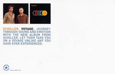 Veröffentlichungsland: USA Promotioncard vom US Partnerlabel Radikal Records zur Schiller CD "Voyage" Maße: 148 mm x 105 mm (Postkartengröße).