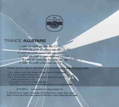 Maxi CD Nr.1 von 2 von "Trance Allstars - Lost In Love". Der Schiller Remix ist Track 6