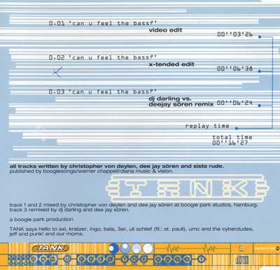 Hinter "Tank" stecken Christopher von Deylen, Dee Jay Sören und Sista Rude. All tracks written by CvD, Dee Jay Sören and Sista Rude