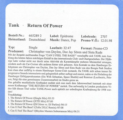 Hinter "Tank" stecken Christopher von Deylen, Dee Jay Sören und Sista Rude. All tracks written by CvD, Dee Jay Sören and Sista Rude +++ Mit Produktinfo +++