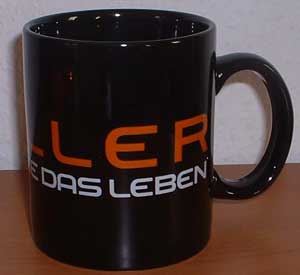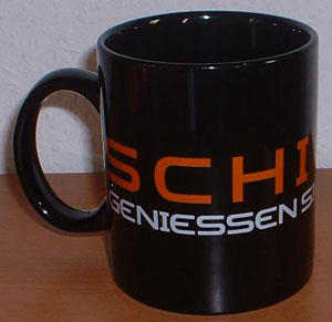 Schwarze Schiller Tasse mit dem Schriftzug "Geniessen Sie Das Leben"