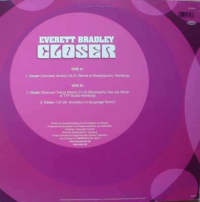 Hinter "Everett Bradley" stecken Christopher von Deylen und Everett Bradley. Produced by CvD and Mirko von Schlieffen. Track B1 remixed by Dee Jay Sören.
